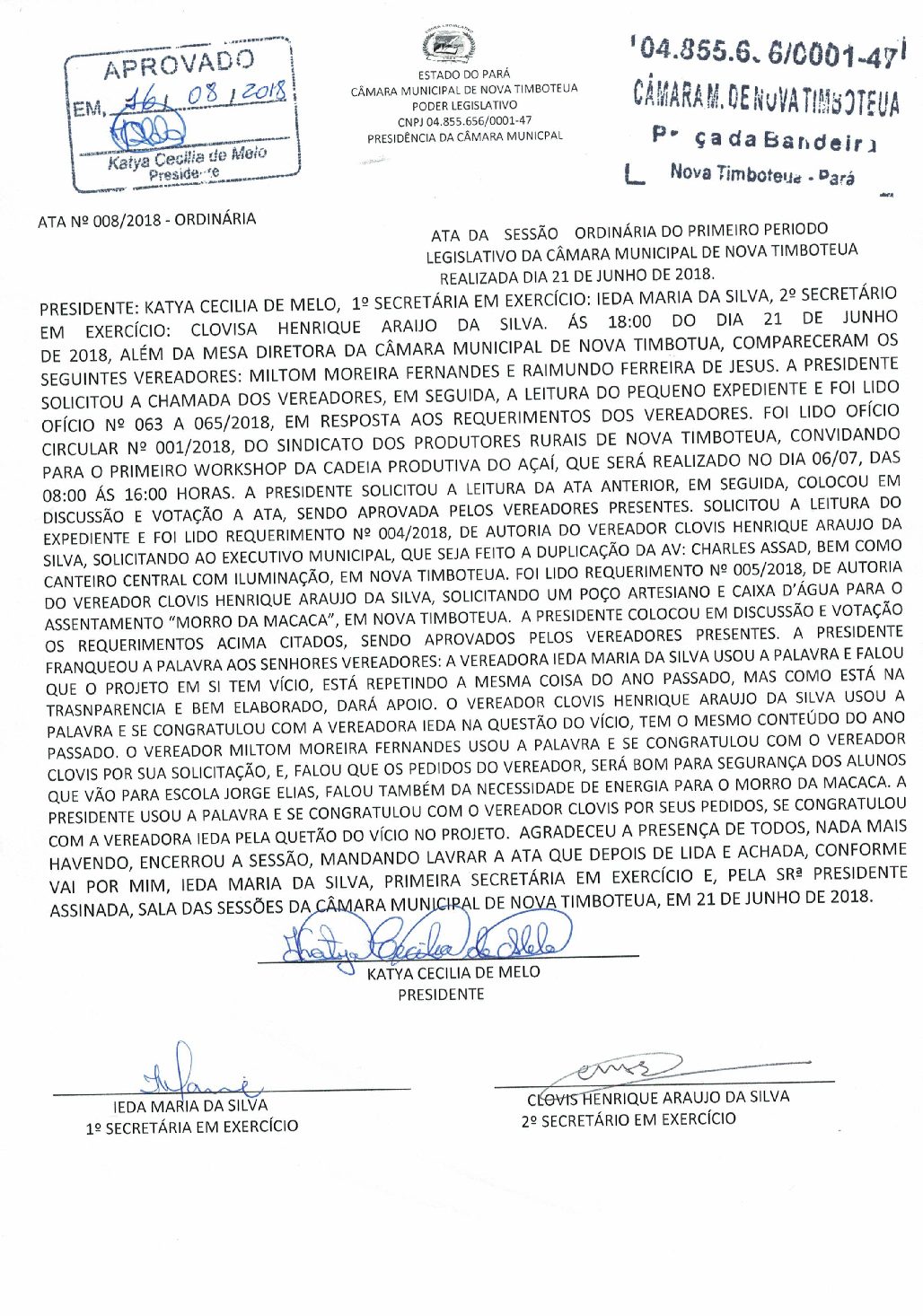 ATA DA SESSÃO ORDINÁRIA Nº 08-2018 DO PRIMEIRO PERÍODO, DE 21 DE JUNHO DE 2018