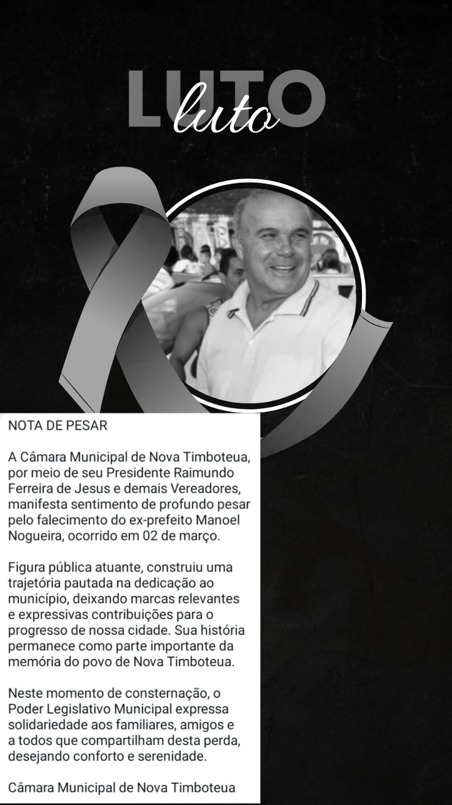 A Câmara Municipal de Nova Timboteua, por meio de seu Presidente Raimundo Ferreira de Jesus e demais Vereadores, manifesta sentimento de profundo pesar pelo falecimento do ex-prefeito Manoel Nogueira, ocorrido em 02 de março.